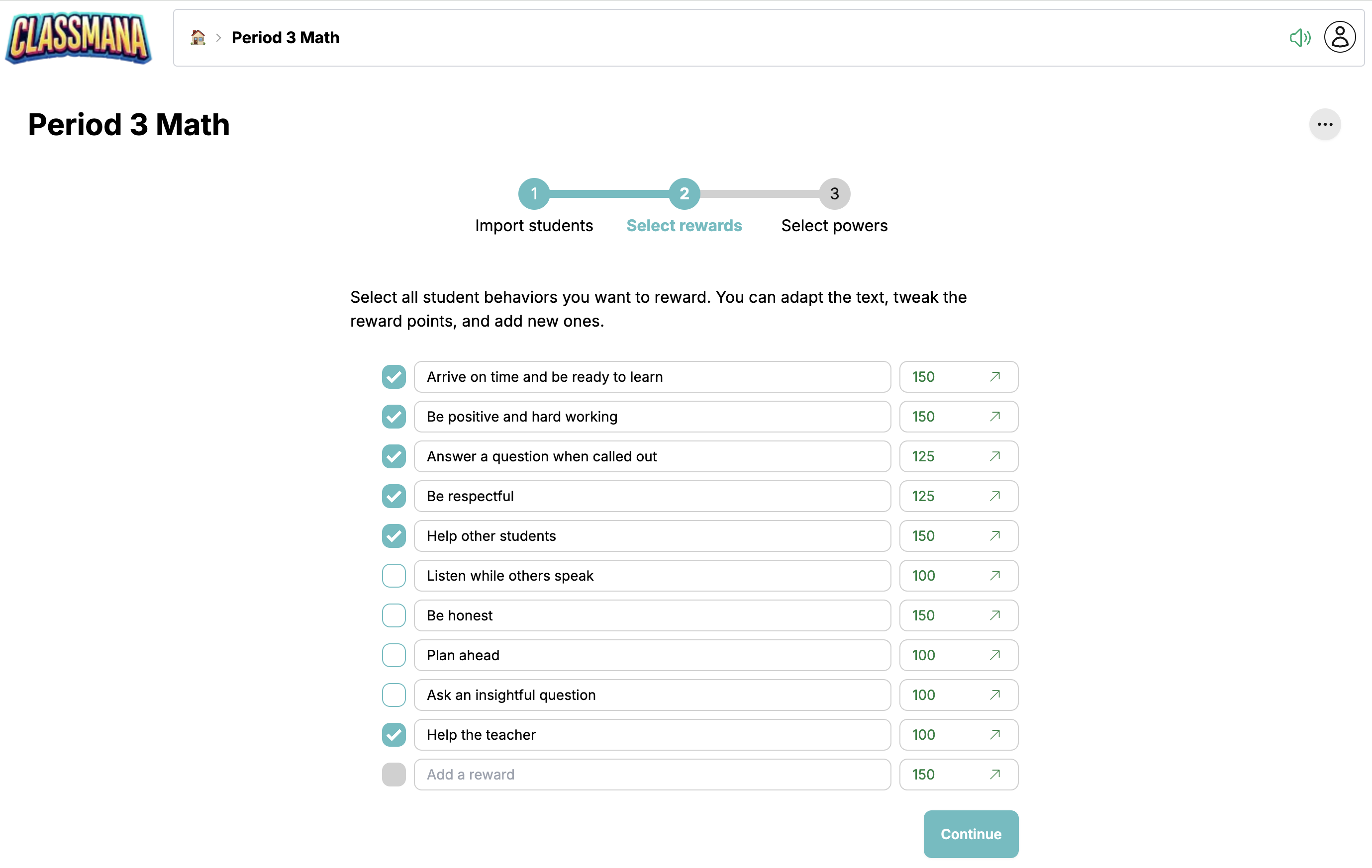 Виберіть винагороди, які ви хочете використовувати, налаштуйте значення очок за потреби, додайте власні, потім натисніть "Продовжити".