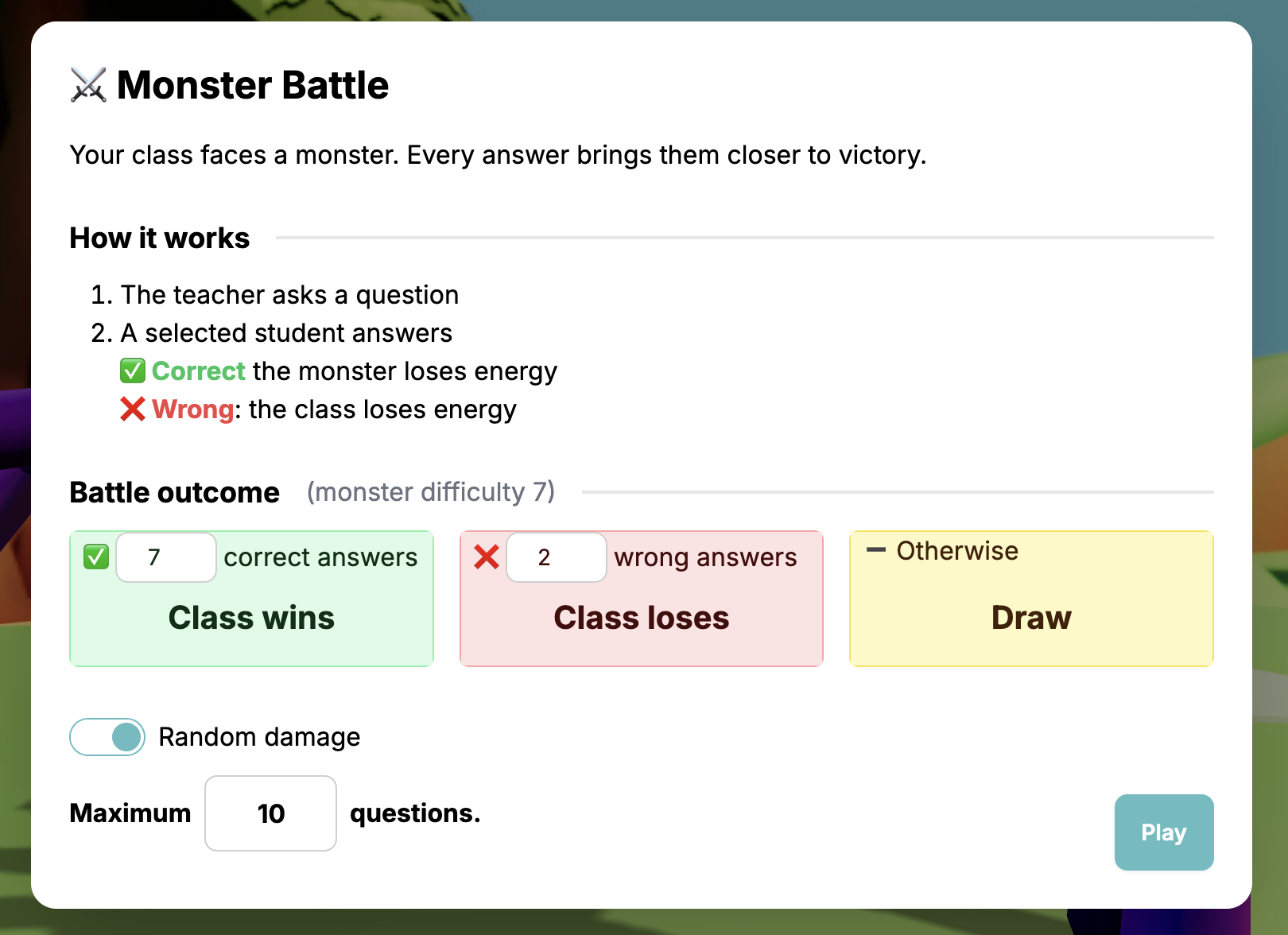 Битва з Монстрами — це інтерактивна класна гра, де учні борються з 3D анімованими монстрами, відповідаючи на питання. Вчителі контролюють процес, оцінюють відповіді та винагороджують учнів за правильні відповіді. Коли учні відповідають правильно, монстр отримує пошкодження. Коли вони відповідають неправильно, клас втрачає енергію!