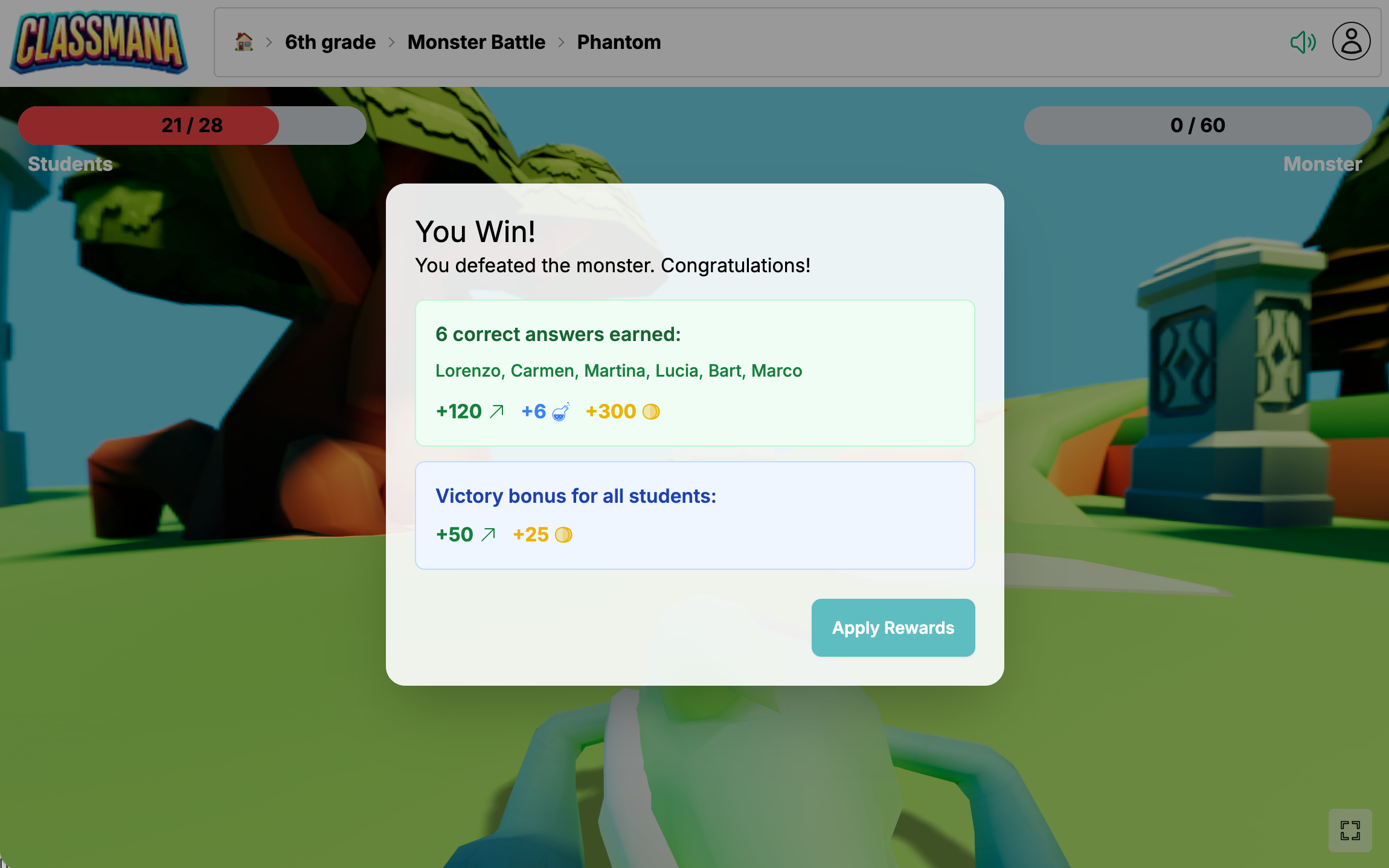 Натисніть Застосувати Винагороди, щоб додати всі винагороди до профілів учнів. Записи журналу активності створюються автоматично з коментарями на кшталт "Правильна Відповідь у Битві з Монстрами" або "Бонус за Перемогу у Битві з Монстрами".